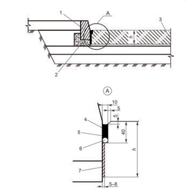 1- бортовой камень; 2 - бетон В 15; 3-цементобетонное покрытие; 4- заполнение битумной мастикой; 5 - полимерная грунтовка; 6 - термостойкий уплотнительный шнур; 7 - мягкая демпферная лента на полимерной основе толщиной 5-8 мм.
