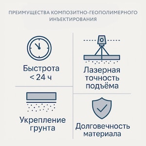 - Скорость — геополимерное инъектирование грунтов и оснований позволяет восстановить геометрию и прочность обычно менее чем за сутки.
