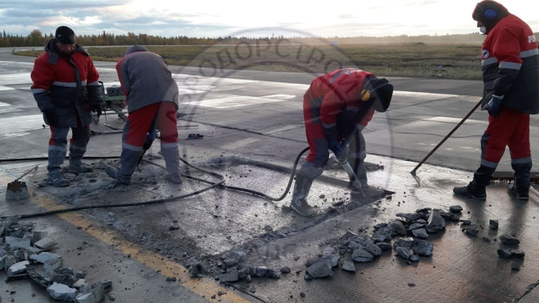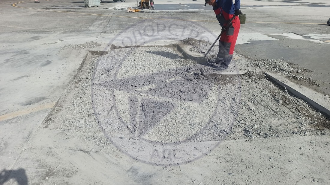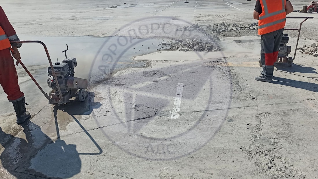 Выполняется замена разрушенной плиты. Этапы работ: разметка и резка на фрагменты, аккуратный демонтаж, подготовка основания, установка арматурного каркаса и анкеров, укладка и уплотнение бетонной смеси, нарезка и герметизация новых швов. Для ускорения работ применяются быстротвердеющие ремонтные составы.