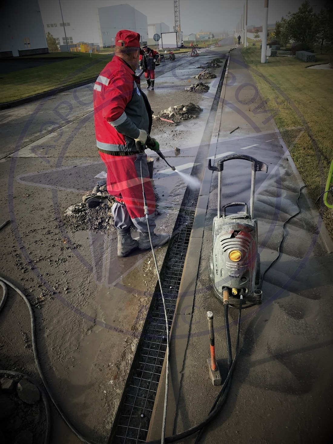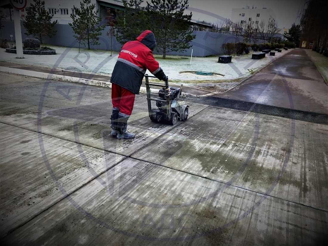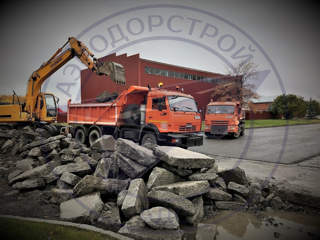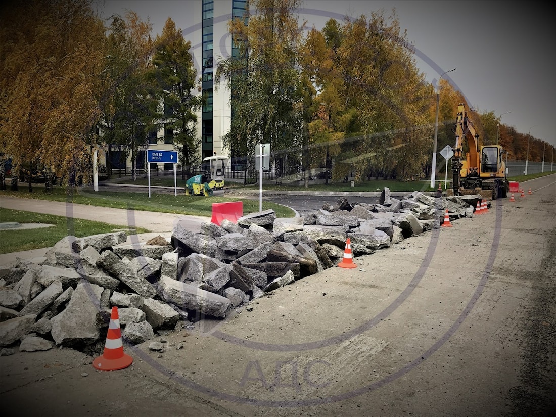 Замене подверглось более 1000 м2 цементобетонного покрытия. В кратчайшие сроки был выполнен демонтаж бетона толщиной плит более 40 см с помощью мощного гидромолота на базе экскаватора с предварительной резкой покрытия по контуру нарезчиками швов. В результате более 400 м3 бетона была демонтировано и вывезено с территории всего за 4 дня, важно что в результате не пострадало новое примыкающее асфальтобетонное покрытие, ни один бортовой камень не был поврежден, ни одна соседняя бетонная плита не треснула и не скололась.