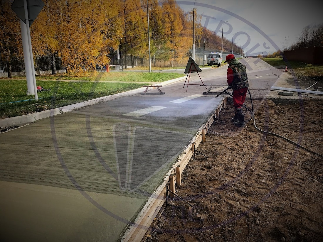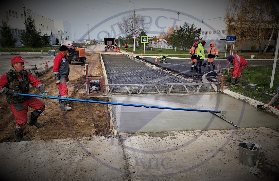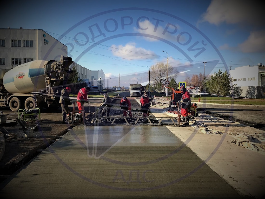 Была произведена замена основания на слой из ЩПС , выполнена теплоизоляционная прокладка над теплосетями проходящими под участком дороги, осуществился комплекс работ по армированию арматурной сеткой и штыревым соединением по периметру участка. Бетонные работы заняли 4 дня, бетонирование выполнялось тяжелыми секционными виброрейками, с дальнейшим комплексом мероприятий по уходу за бетоном ( обработка поверхности свежеуложенного бетона пленкообразующим материалом «ПЭВЕЙЛ» и укрытием поверхности геотекстилем «Дорнит»).