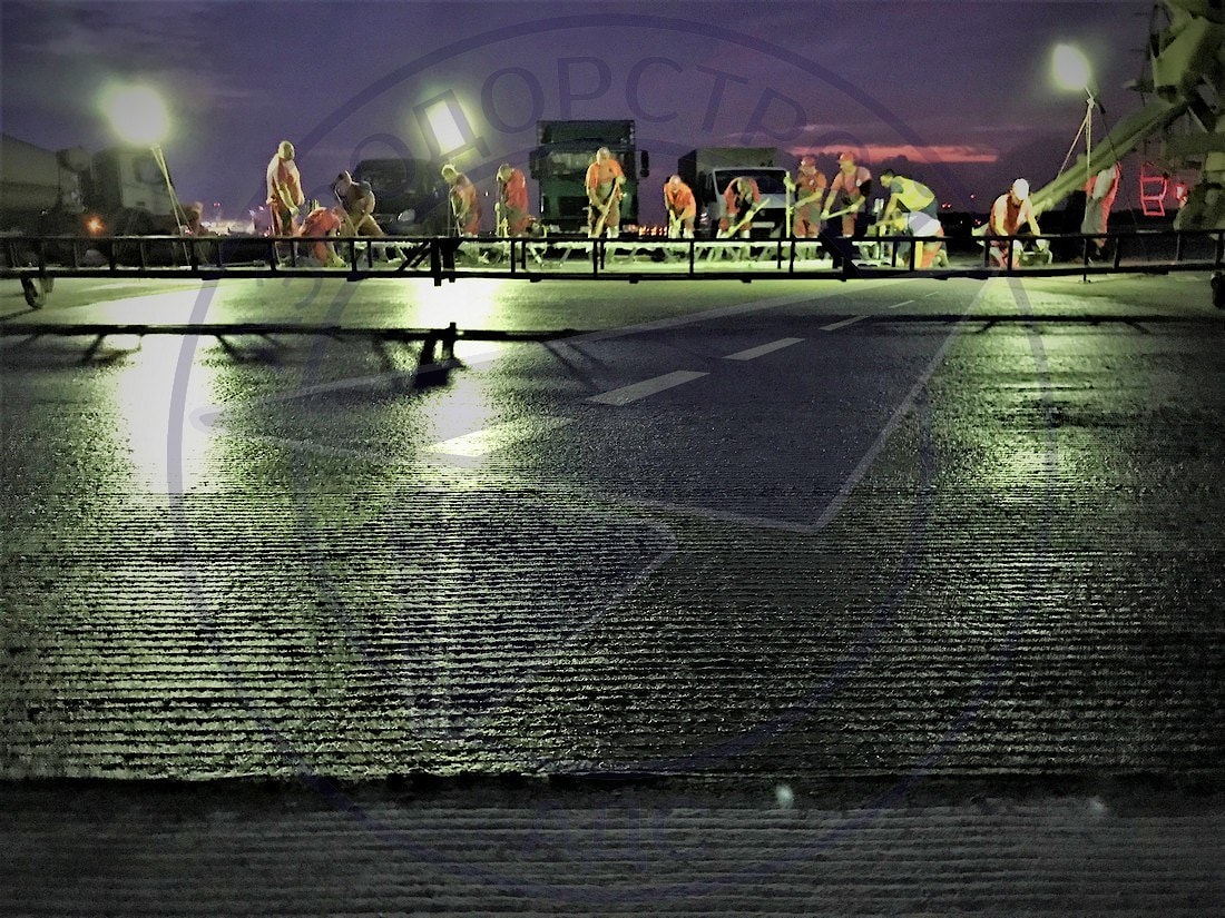 После завершения демонтажных работ, было выполнено устройство изоляционного слоя и краевое армирование каждой плиты. Подбор состава бетона играл ключевую роль в ходе строительства, было принято решение применять бетон В 45 Btb4.8 F200 с добавлением пластификаторов и специальных добавок концерна BASF. В дальнейшем новое покрытие было обработано гидрофобизирующим составом – «Гидрофикс АЭРО». Работы по замене покрытия выполнялись в 2 смены , что позволило завершить весь процесс менее чем за месяц.