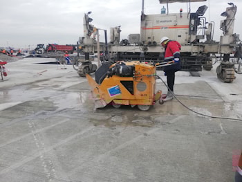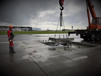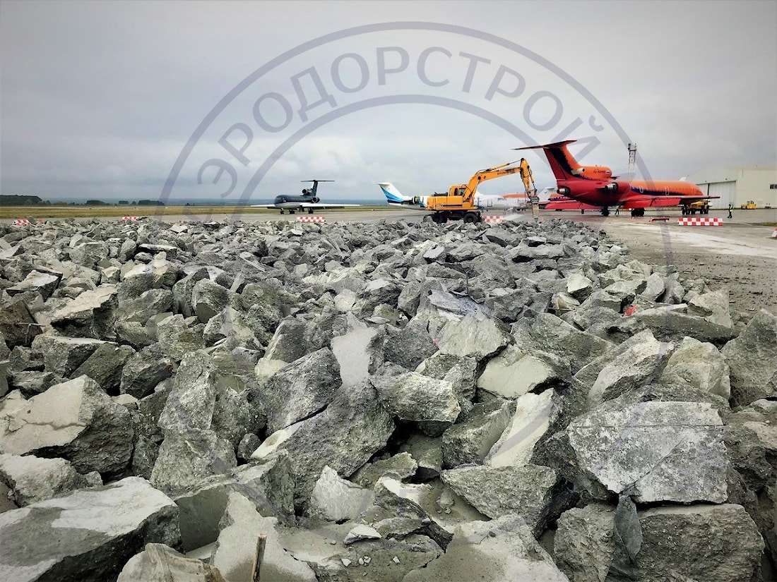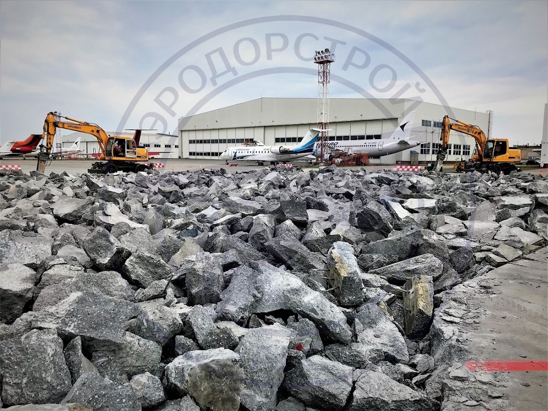- Демонтаж существующего армобетонного покрытия методом разлома. При этом демонтаж ряда краевых плит выполнялся путём предварительной нарезки плит на сегменты с помощью нарезчиков швов с последующим использованием цанговых захватов и автокрана. Основная часть поврежденных плит была демонтирована с помощью трёх гидромолотов на колесном ходу на базе экскаваторов Hyuindai. Работы выполнялись в 2 смены, дабы максимально ускорить производственный процесс.