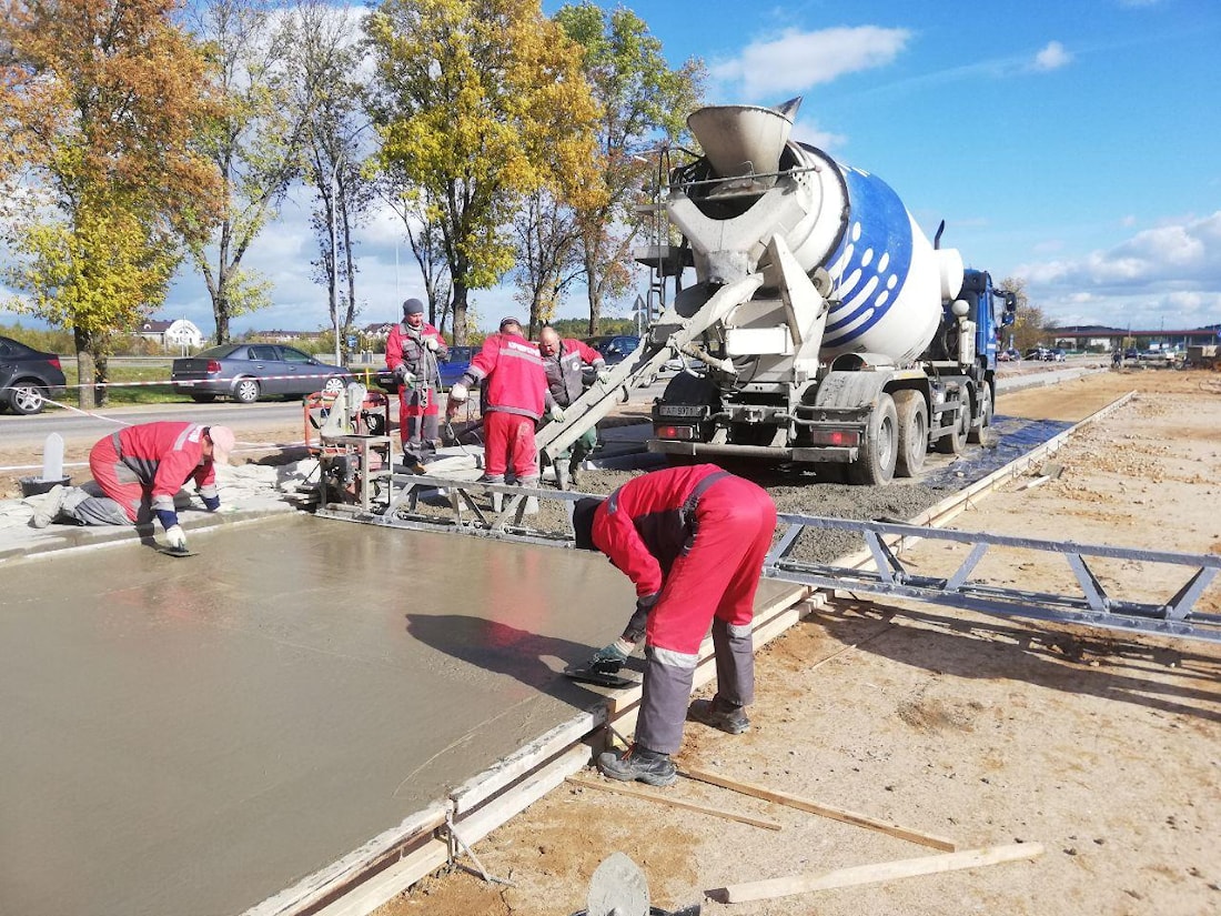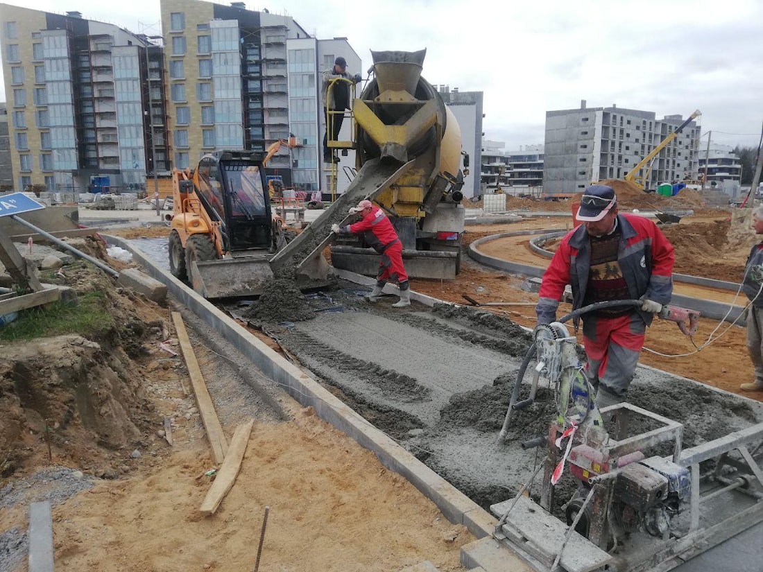 Специалисты компании «Аэродорстрой» владеют различными технологиями укладки тротуаров и дорожек. Наиболее популярным в сжатых городских условиях является метод с использованием опалубки и секционных виброреек. А вот при значительных объемах бетонирования и когда пространство позволяет, актуальным становится применение бетоноукладочного комплекса Gomaco. Данная техника позволяет укладывать в среднем до 3000 м2 дорожного при толщине слоя 16 см. Тротуары могут выполняться как с односкатным так и с двускатным профилем. Для хорошего водоотвода необходимо ответственно отнестись к геодезической разбивки и контролю поверхностных уклонов при устройстве цементобетонного покрытия. Практически всегда к тротуарам с двух сторон примыкают бортовые камни, защищающие кромку бетона от сколов, а саму дорогу от подмывов и проседания. Завершающим этапом является устройство деформационных швов сжатия и расширения. Швы нарезаются с определенным интервалом, зависящим от толщины и ширины покрытия, а также климатических условий региона.