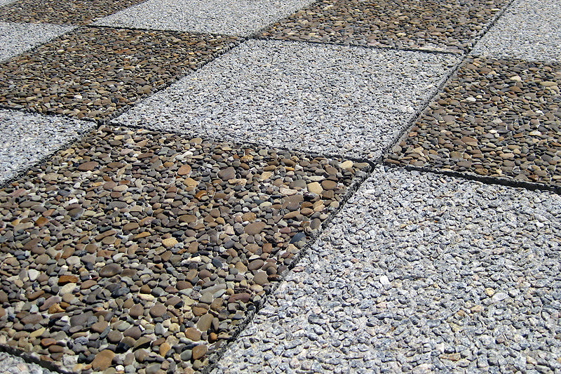Мытый бетон по сути – это материал на основе цементного камня, поверхность которого не ровная и гладкая, а шероховатая и каменистая. При этом технология предусматривает возможность применять в качестве заполнителя различные материалы: доломит, кварцит, гранитный щебень, мраморную крошку, речную и морскую гальку.