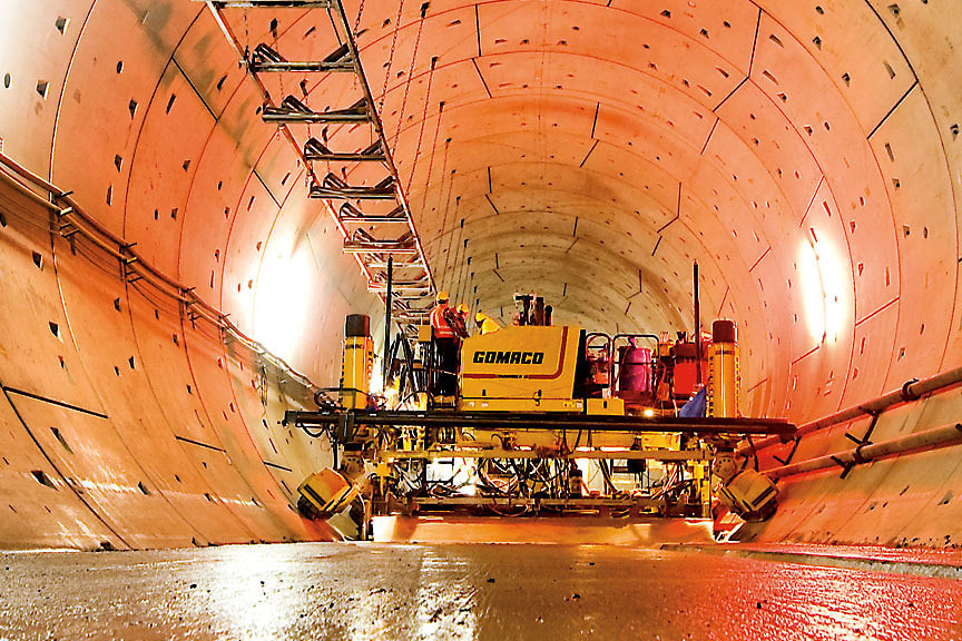 Процесс устройства бетонного покрытия в туннелях аналогичен как и в случаях с дорогами и аэродромными покрытиями. Однако логистика может быть более сложной из-за ограниченного пространства по ширине и высоте.