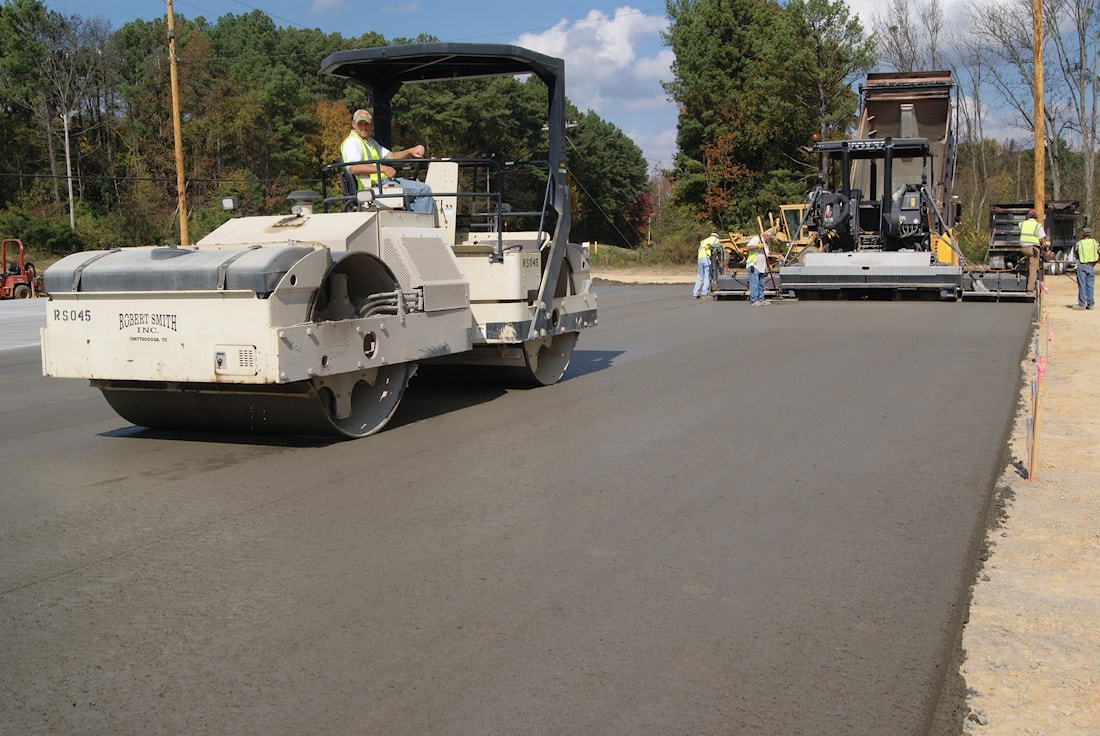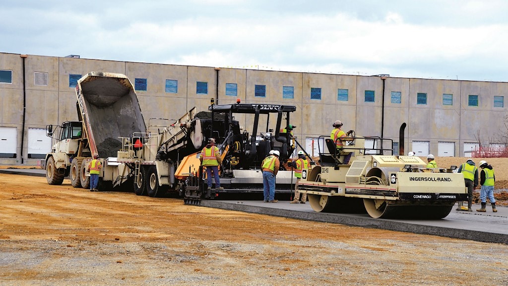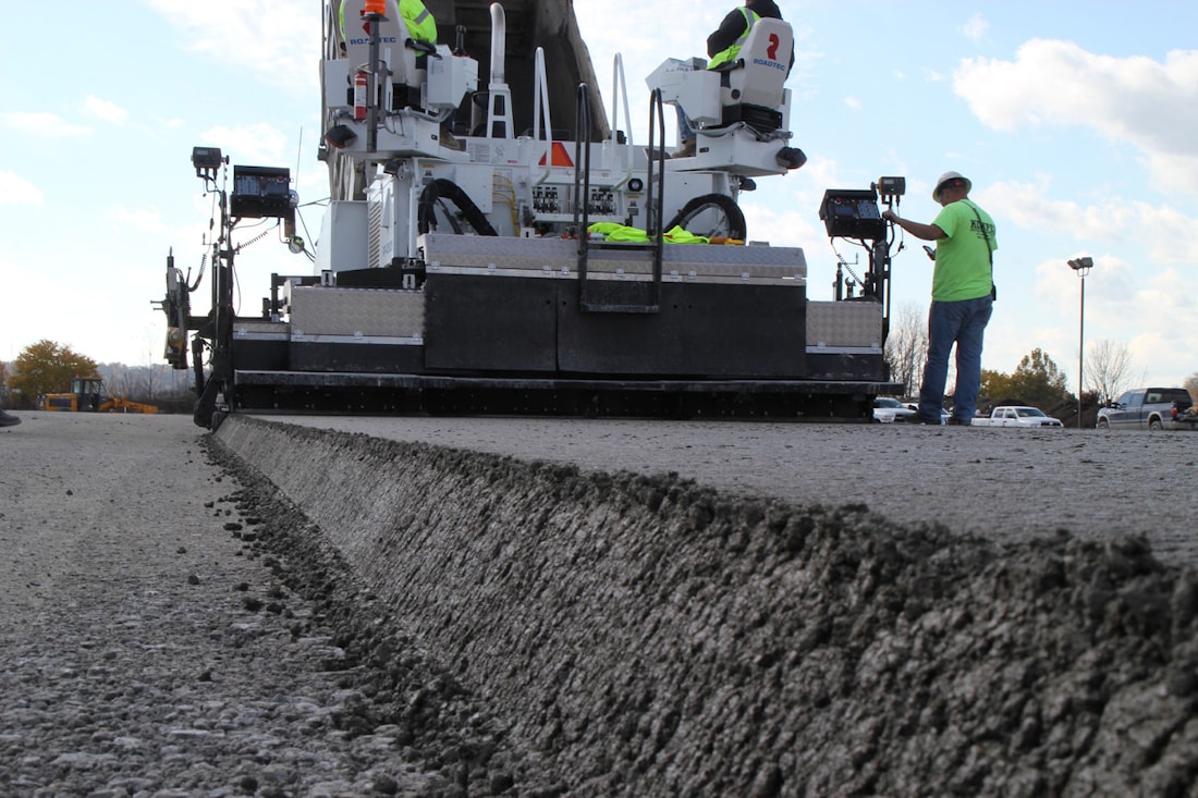Консистенция бетона должна быть влажной, как земля, чтобы бетон уже имел требуемую стабильность при обработке асфальтоукладчиком. Для устройства покрытий из жестких бетонных смесей рекомендуется использовать асфальтоукладчики, оборудованные мощным уплотняющим трамбующим брусом, специально предназначенным для уплотнения цементно-минеральным смесей. При использовании асфальтоукладчика, оборудованного специальным уплотняющим брусом, толщина укладываемого слоя должна быть на 10-15 % , а при использовании обычного асфальтоукладчика толщина укладываемого слоя в неуплотненном состоянии должна быть на 20-25 % больше проектной толщины. После прохода асфальтоукладчика поверхность необходимо окончательно утрамбовать катками массой от 8 до 12 тонн. Благодаря такому дополнительному уплотнению можно получить однородную, закрытую и ровную бетонную поверхность.