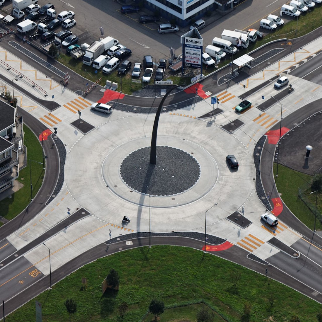 Бетонное покрытие кольцевой проезжей части в основном делится на плиты круглых сегментов. Среднее тангенциальное соединение может быть необходимо для обеспечения благоприятной геометрии пластины . Из-за постоянного перебега этот стык также следует укреплять армированием с помощью штыревого соединения для обеспечения передачи поперечного усилия. На небольших кольцевых развязках бетонное покрытие выполняется вручную виброрейками , но возможно и машинное покрытие с помощью бетоноукладчика . Круговая проезжая часть, въезды и выезды должны быть разделены швов сопряжения без армирования. Бордюры и водосточные желоба могут быть выполнены в виде клееных плит или с монолитной бетонной конструкцией для увеличения долговечности.