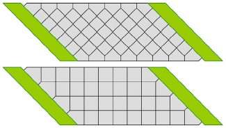 В обеих конфигурациях расположения плит в местах стыка с бордюрным камнем или примыканием к новому покрытию мы получаем плиты неправильной формы (так называемые «шляпы епископа»), которые должны быть расположены в области границ поверхности, идущих под углом к стыкам, чтобы избежать неблагоприятных острых углов плит. Укрепление "шляп епископа" обычно не требуется.