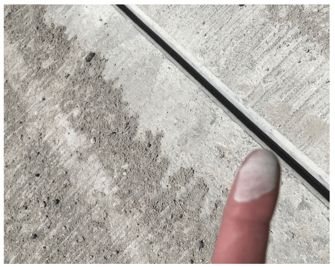 - При нарезке швов нередко допускаются ошибки при разбивке и разметке будущих швов. В результате чего прорезанные продольные и поперечные деформационные швы пересекаются между собой под острым углом, а также подходят к бортовому камню, водоотводному лотку, колодцу или другому типу покрытия также не перпендикулярно. Как правило в таких местах пересечения в будущем возникают сколы. КАК НАДО: Поперечные и продольные швы должны пересекаться между собой строго под углом 90 ° , но и подходить к бортовому камню, водоотводному лотку, смотровым колодцам и прочим элементам плоскостной инфраструктуры и другим типам покрытия также под прямым углом.