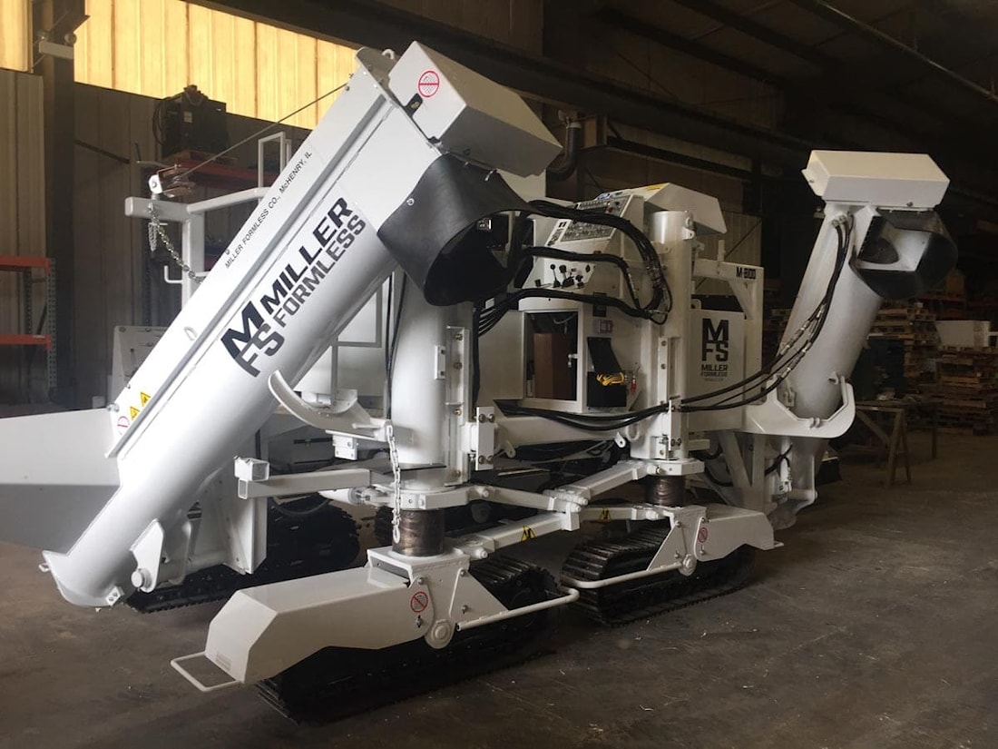 Бетоноукладчик M-7540 поставляется в комплекте с сборным тентом защищающим оператора и панель управления от воздействия осадков. Четыре гусеничные тележки идут в сборке с уретановыми башмаками. Для работы в ночное время наши специалисты предоставляют специальный комплект вспомогательного рабочего светодиодного освещения . Для равномерной подачи бетонной смеси бетоноукладочный комплекс укомплектован конвейером для перегрузки материала. Бетоноукладчик со скользящей опалубкой можно использовать не только для возведения покрытия, но и для устройства вспомогательный элементов дорожной инфраструктуры. Так Miller Formless 7540 имеет в наличие комплект форм для устройства монолитных профилей ( водоотводных лотков, бордюров, желобов, барьерных ограждения по типу Нью Джерси, форм кюветов).