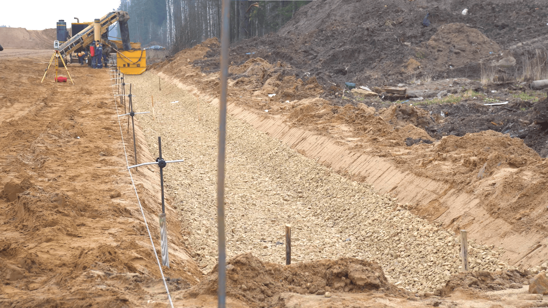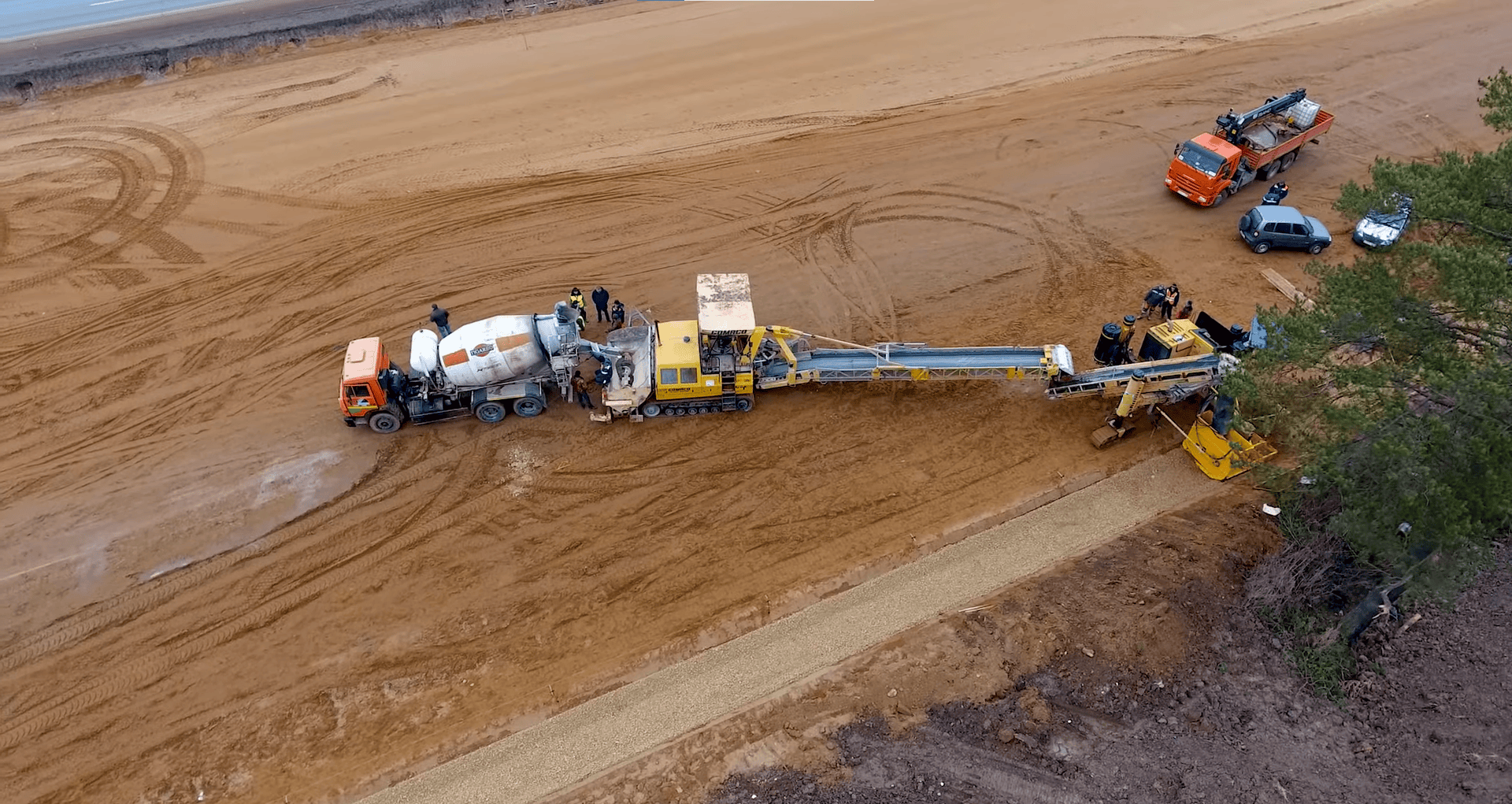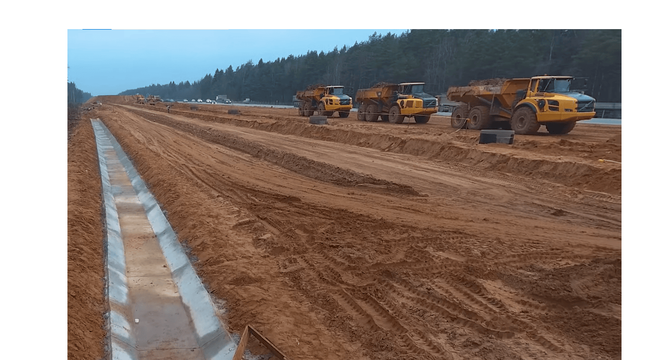 При строительстве автомобильных дорог неотъемлемым элементом дорожного полотна является кювет. Кюветы необходимо устраивать в выемках, на участках низких насыпей и нулевых отметок для увеличения устойчивости и прочности полотна. Наша компания готова поделиться своим передовым опытом по устройству водоотводных канав (кюветов) при помощи бетоноукладчика со скользящей опалубкой. Для бетонирования кюветом нами используется трёхгусеничный бетоноукладчик Gomaco Commander III в сочетании с распределителем и перегружателем бетонной смеси Gomaco RTP 500. Укладку бетонной смеси производят на заранее сформированное уплотненное щебёночное основание.