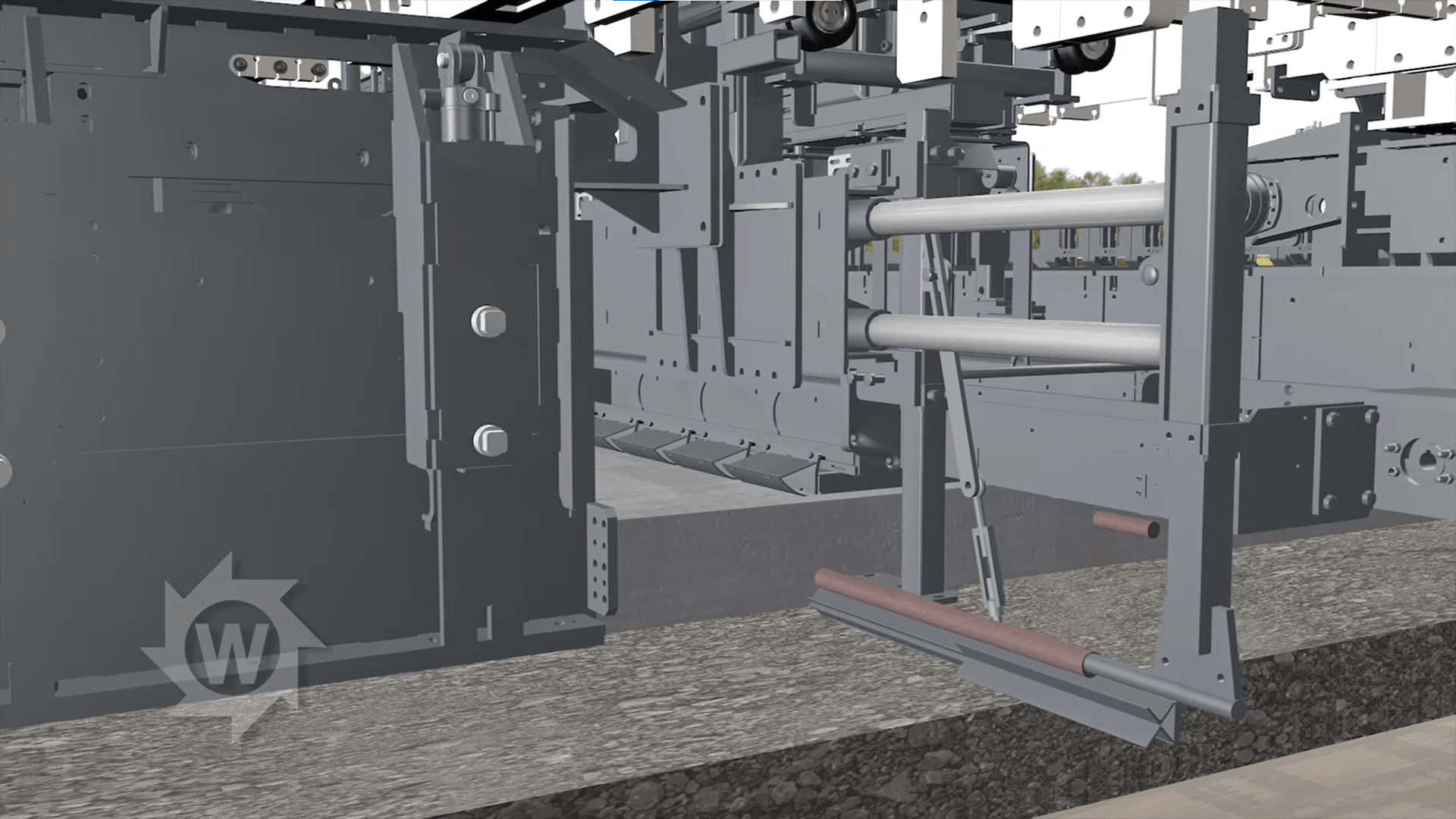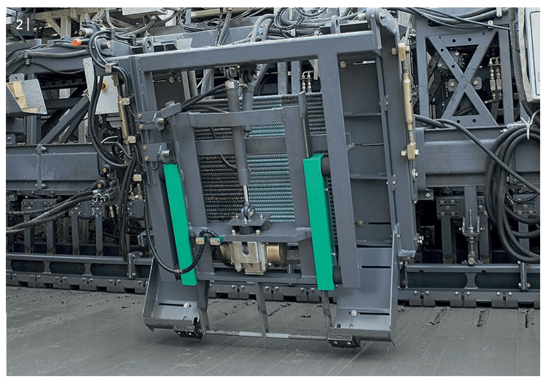 Устройство вибропогружения анкеров в продольный шов располагается сбоку от бетоноукладчика. После установки анкера в теле бетона, цементобетонное покрытие затирается отделочным брусом. Благодаря этому создаётся идеально ровное цементобетонное покрытие, соответствующее строительным нормам и правилам. Таким образом применение системы вибропогружения боковых анкеров для сопряжения смежных полос позволит увеличить производительность бетоноукладки при этом повысив качество и точность армирования.