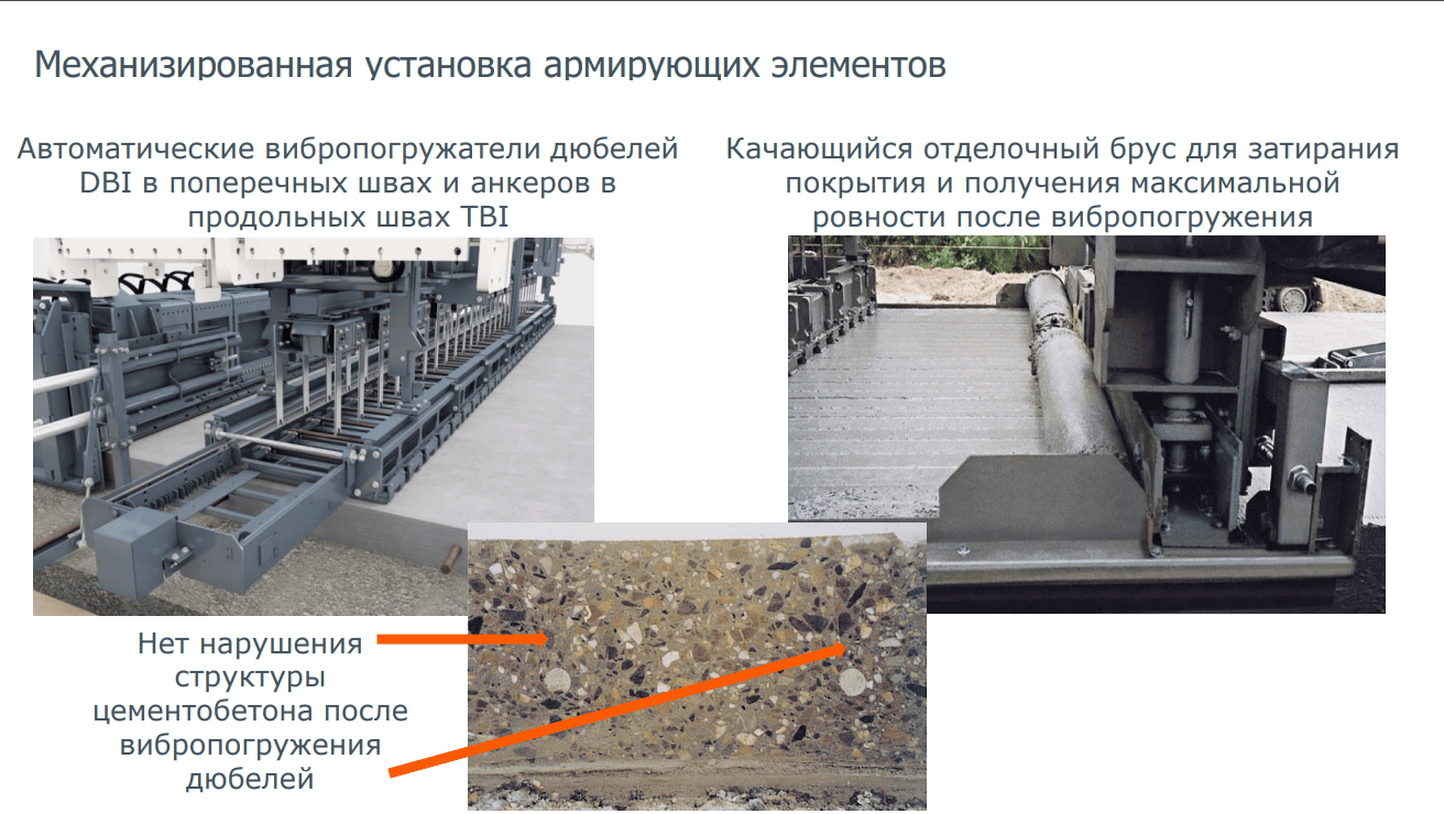В целях экономии времени и уменьшения трудоёмкости производства, всё чаще можно увидеть механизированную установку армирующих элементов при устройстве цементобетонных покрытий. Современные бетоноукладчики Gomaco и Wirtgen оснащены автоматической системой вибропогружения дюбелей (штырей) DBI в поперечных и продольных швах ( TBI). Бетоноукладчики со скользящими формами при погружении армирующих элементов в швы, не останавливаются, а продолжают движение. Нет необходимости задействовать отдельное звено рабочих для сверление бетона и установки анкеров. Главное, чтобы в боковой форме анкеровщика было достаточное количество штырей и дюбелей.