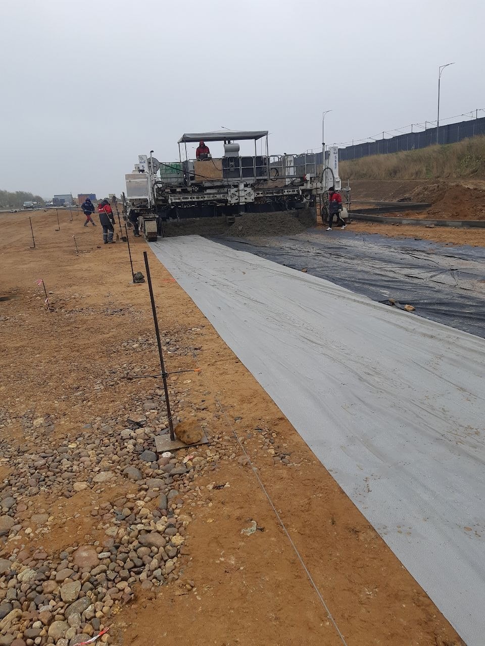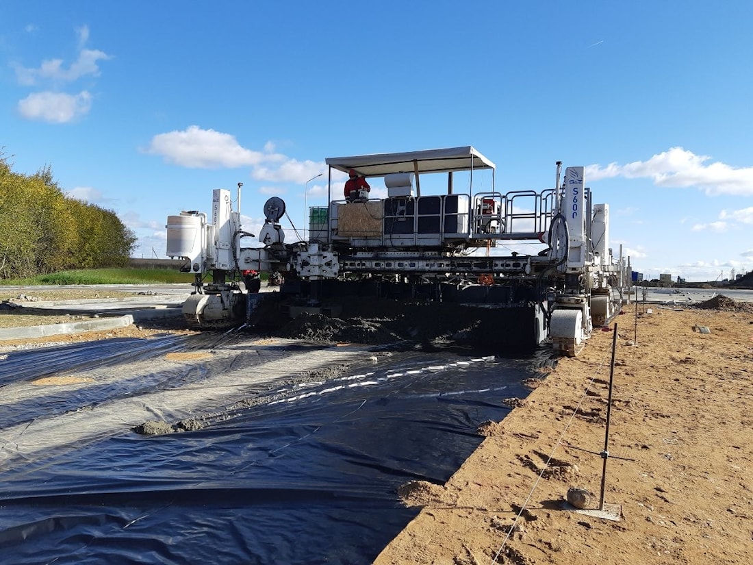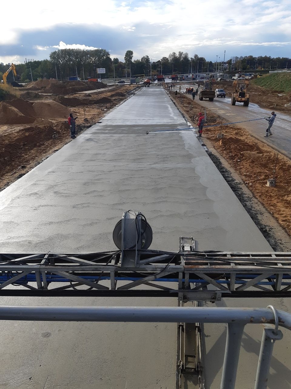 Для возведения цементобетонного покрытия на объекте поочередно было задействовано два бетоноукладочных комплекса GOMACO Commander III и Guntert Zimmerman. Для высокоточной и быстрой подачи смеси под бетоноукладчик на объекте применялся перегружатель бетона GOMACO RTP 500. На некоторых участках уширения и поворотах, бетонирование производилось при помощи секционных виброреек.