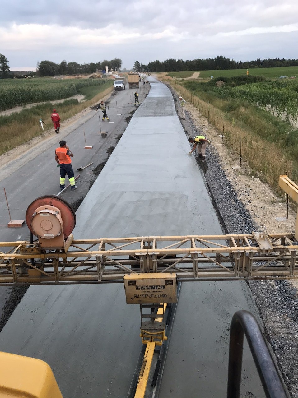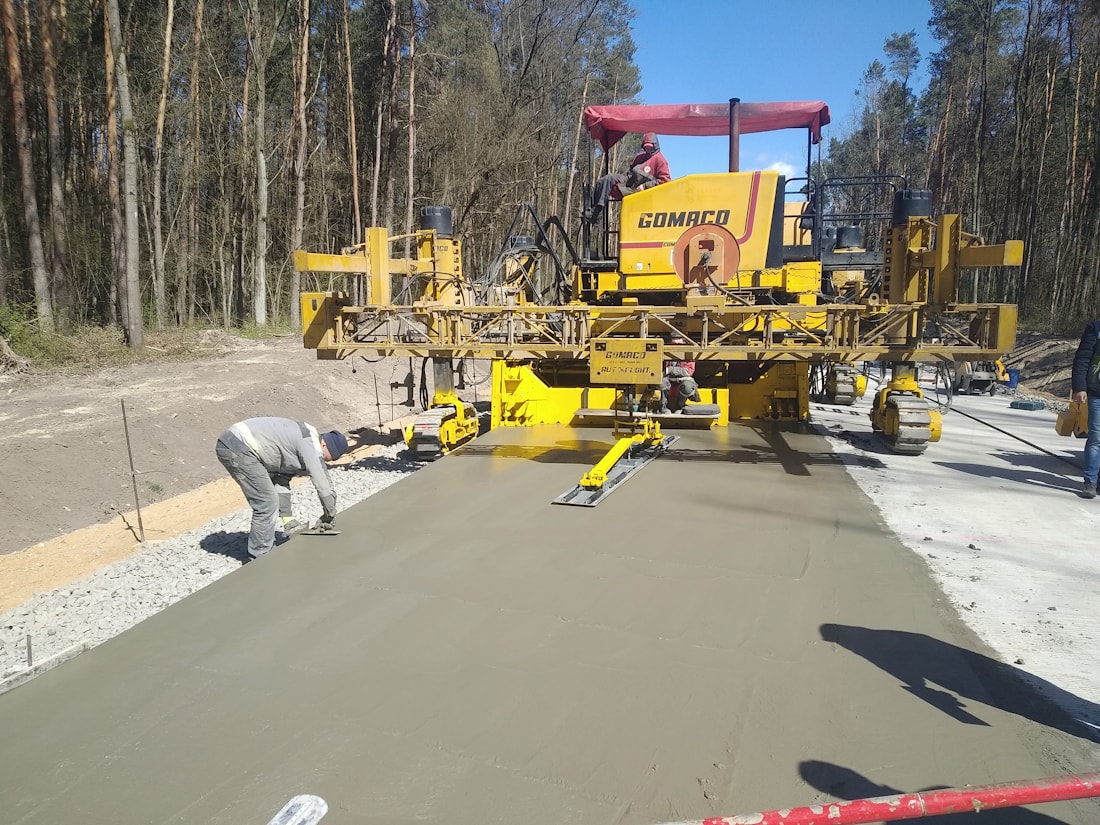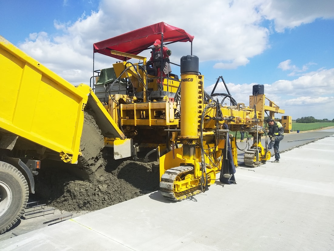 Для возведения цементобетонного покрытия на объекте поочередно было задействовано два бетоноукладочных комплекса GOMACO Commander III и Guntert Zimmerman. Для высокоточной и быстрой подачи смеси под бетоноукладчик на объекте применялся перегружатель бетона GOMACO RTP 500. На некоторых участках уширения и поворотах, бетонирование производилось при помощи секционных виброреек.