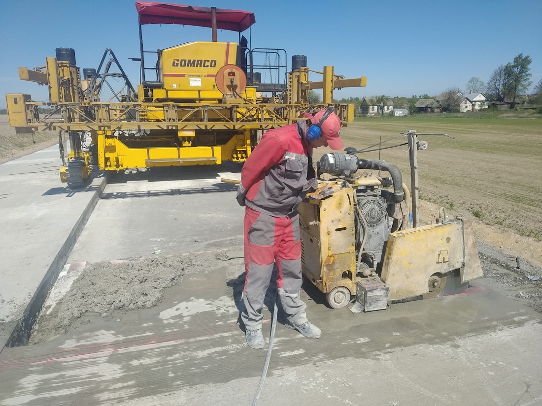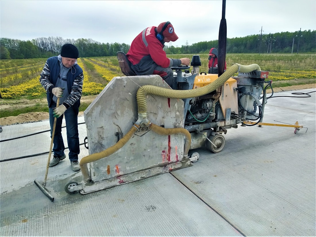 Согласно проекта в покрытии из тяжелого бетона Btb 4.4 было предусмотрено устройство поперечных и продольных швов сжатия. Продольный осевой шов устраивается на всем протяжении устройства новой дорожной одежды. Поперечные швы сжатия устраивались с шагом через каждые 5 м. В швах сжатия устраивались штыри из арматуры d 18 мм А240 в поперечных и из арматуры d 16 мм А 240 в продольных. В поперечных швах сжатия штыри крепились на установочные шпильки из арматуры d 6 мм. Нарезку деформационных швов выполняли при помощи мощных дизельных швонарезчиков CEDIMA, LISSMAC, MECO. В качестве герметика в швах была применена полимерная битумная мастика горячего применения.