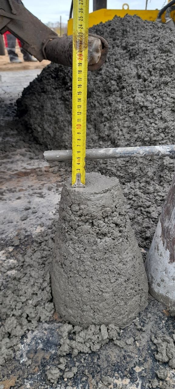 Подвижность бетонной смеси проверяли по методу осадки конуса (ОК), которой определяется пластичность бетона. Бетонная смесь из каждой партии проходила проверку при помощи специального усеченного конуса Абрамса. Он плотно заполнятся бетоном, затем аккуратно снимается, и производится замер, насколько содержимое конуса просело под собственным весом. При укладке бетона при помощи бетоноукладчика, нормальный показатель ОК равняется от 2 до 5 см. Если этот параметр будет менее указанного значения то бетон получится слишком жесткий и ему нельзя будет придать необходимую текстуру, если же больше , то смесь будет чересчур подвижной и "расползется".