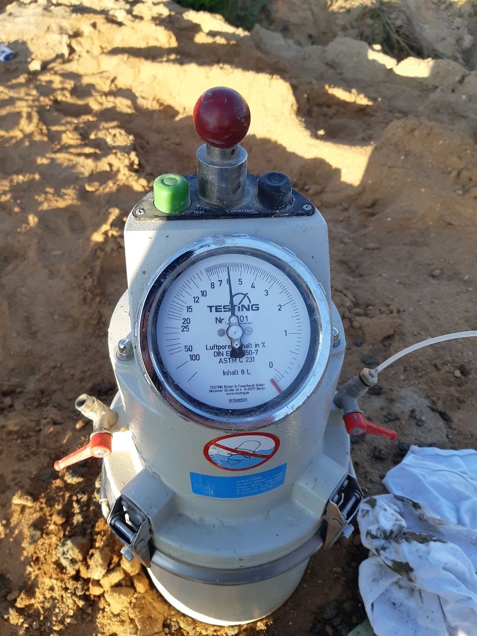 Для измерения воздухововлечения у инженерно-технического персонала на объекте были задействованы поромеры TESTING приборы. Для получения качественного, долговечного и надёжного бетонного покрытия необходимо контролировать значения воздуховолечения в процессе бетоноукладки. Для дорожного бетонного покрытия объём вовлеченного воздуха = 5-6%