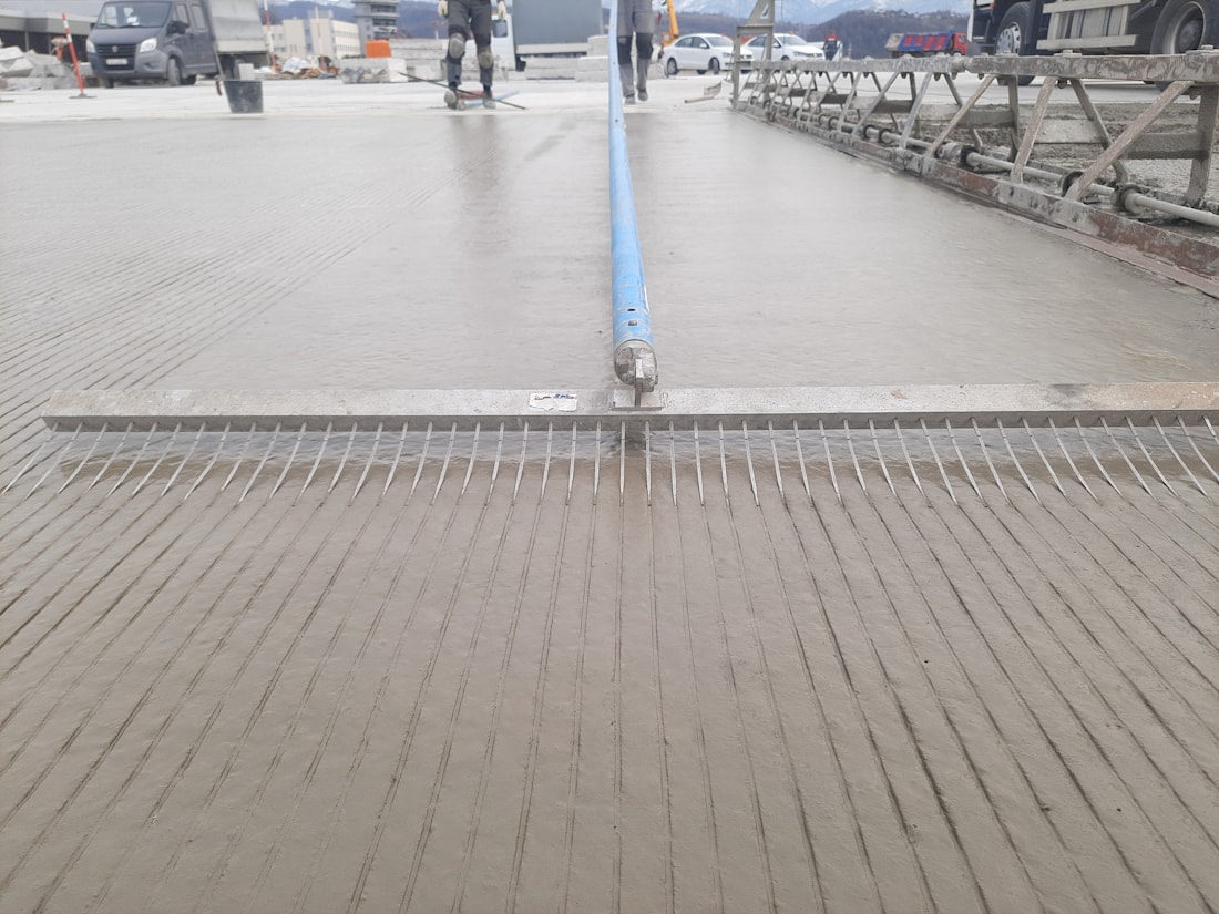 После прохождения бетоноукладчика производилась последующая эффективная обработка с помощью текстурировщика. Текстурирование проезжей части повышает безопасность дорожного движения. В результате поверхность получается слегка рифленая, что нужно для хорошего сцепления с колесами автомобиля. После текстурирования бетон покрывался плёнкообразующим материалом ПМ 100А, предотвращающим чрезмерное испарение влаги. Если тяжелый бетон оставить без этого покрытия, то это приведёт к обильному появлению усадочных трещин. Покрытия плёнкообразующим хватает на весь период набора прочности бетона и он уже не будет подвержен пересыханию.