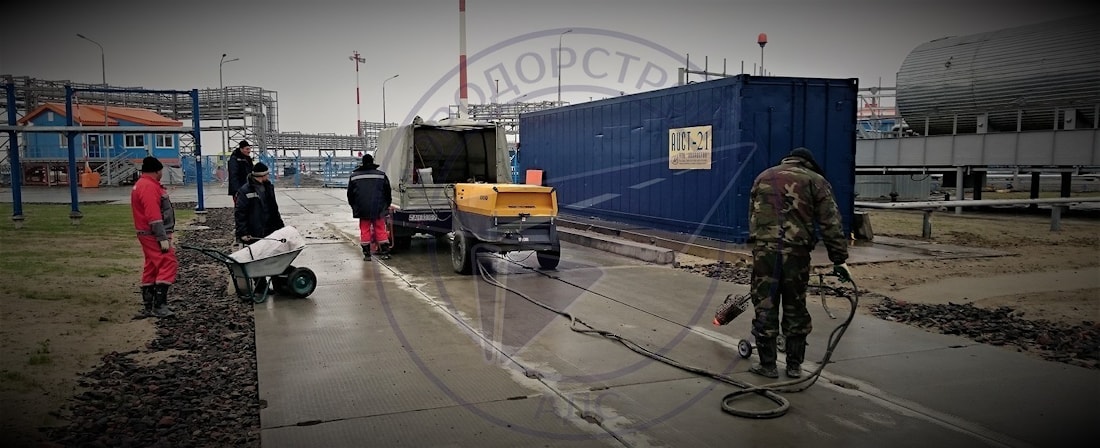 Состав цементно-песчаной смеси приготавливается в пропорции 1:4. Подготовка швов в сборном покрытии перед заливкой включает в себя все те же базовые операции, как и в монолитном покрытии. Швы очищаются металлическими жгутовыми щетками и затем продуваются сжатым воздухом от пыли и грязи, грани швов грунтуются полимерной грунтовкой (праймером).