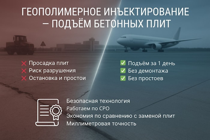 ООО «АЭРОДОРСТРОЙ» специализируется на восстановлении и подъёме бетонных конструкций с использованием современной геополимерной технологии. Метод композитно-геополимерного инъектирования обеспечивает стабильность оснований и длительный срок службы конструкций.